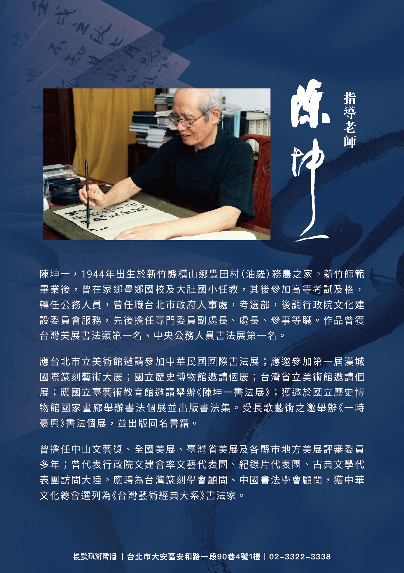 陳坤一,1944年出生於新竹縣橫山鄉豐田村(油羅)務農之家。新竹師範畢業後,曾在家鄉豐鄉國校及大肚國小任教,其後參加高等考試及格,轉任公務人員,曾任職台北市政府人事處,考選部,後調行政院文化建設委員會服務,先後擔任專門委員副處長、處長、參事等職。作品曾獲全國美展書法類第一名、中央公務人員書法展第一名。